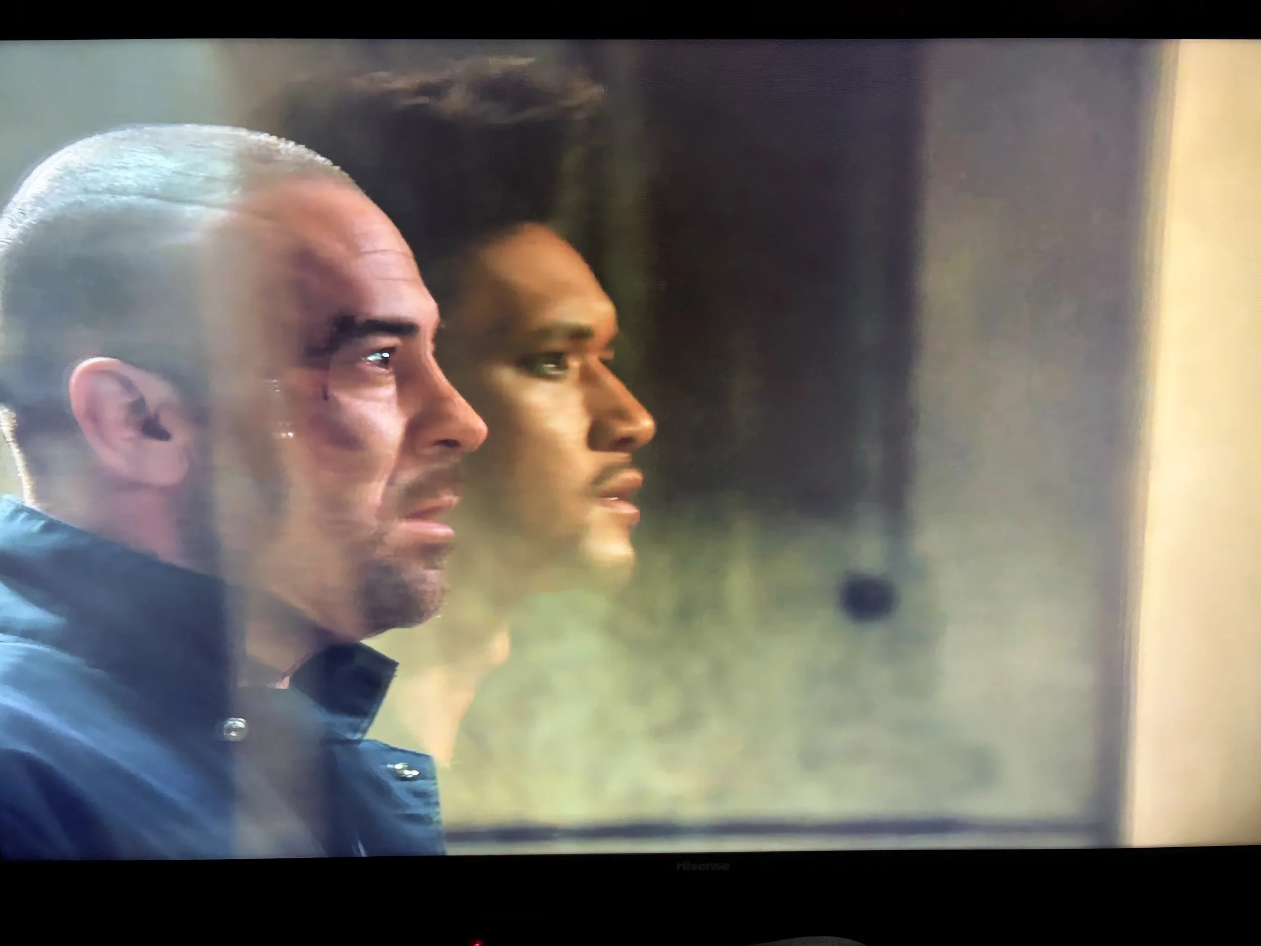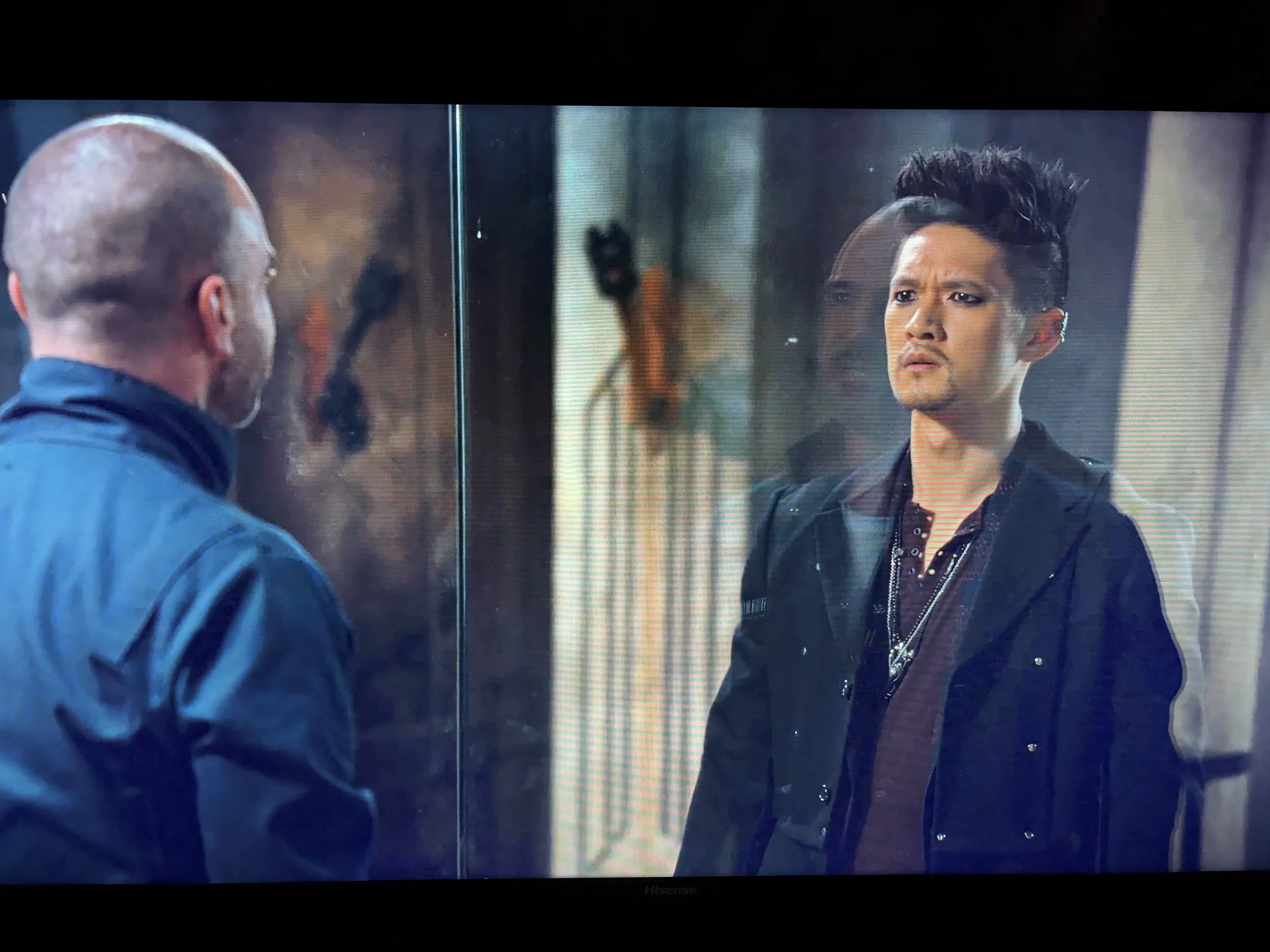 I love this face off scene. The banter between Magnus and Valentine is great. Harry and Alan play off each other so well. I also love the way the reflection overlaps the face.